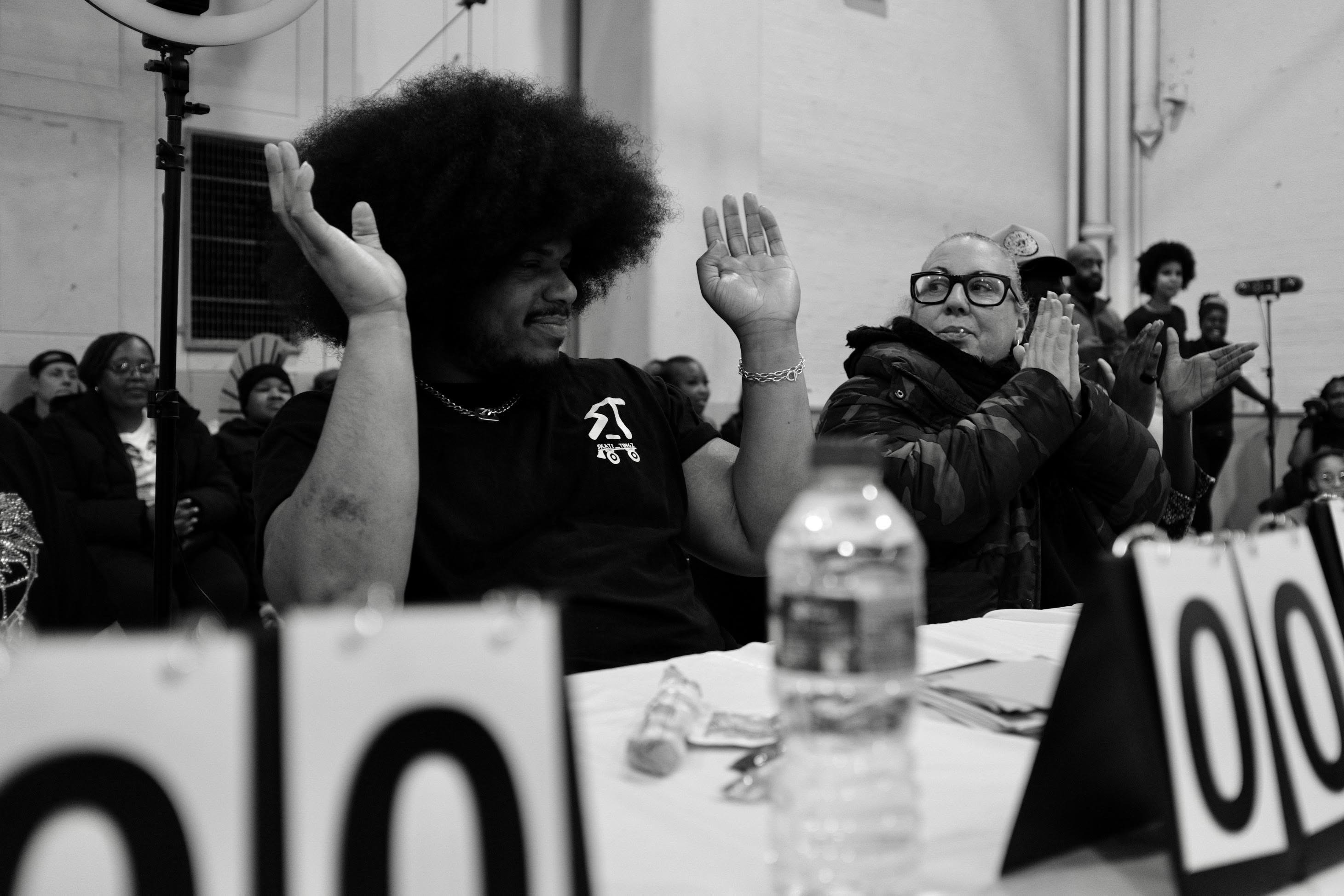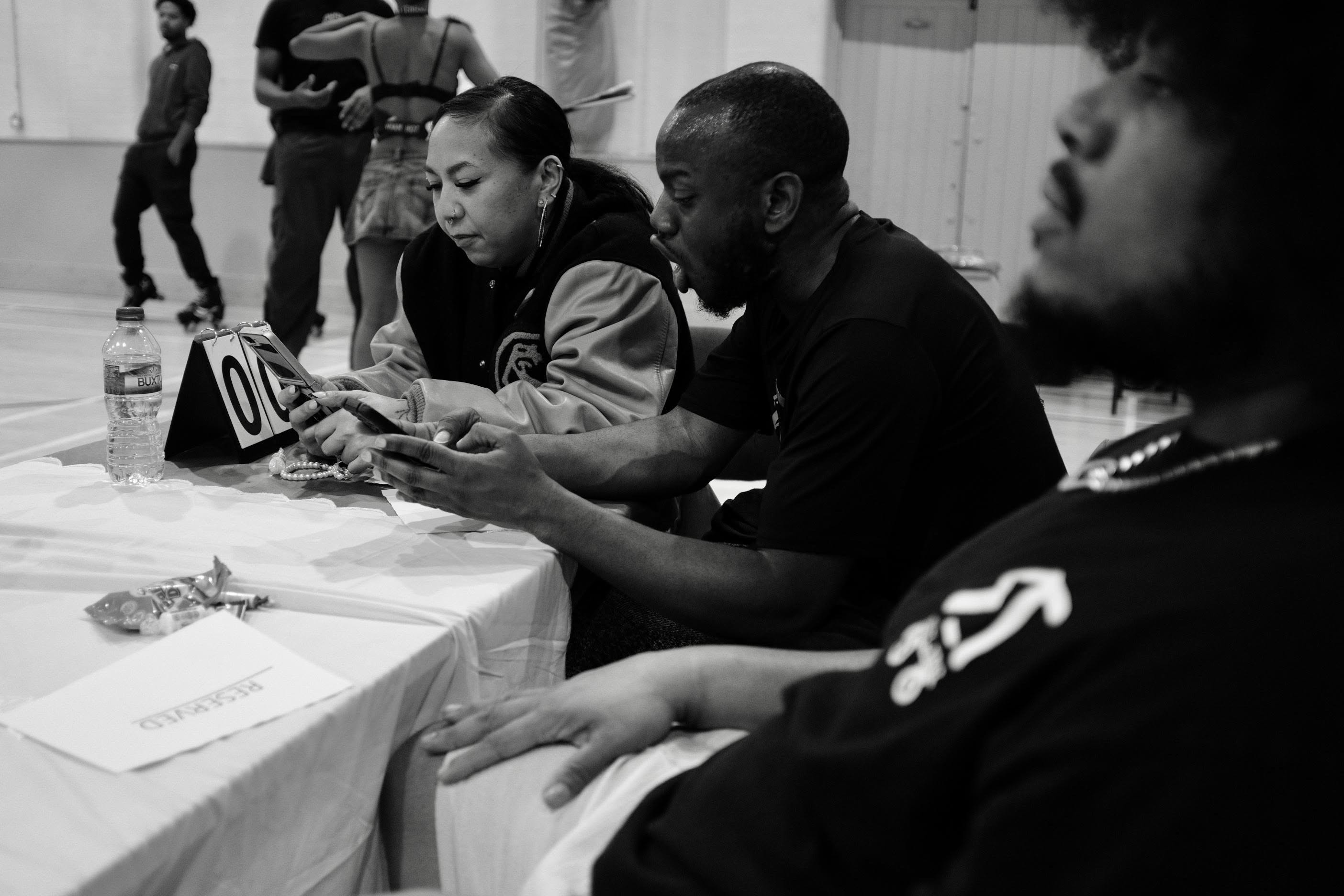 Soon enough, the moment arrived for the seven judges to take their seats by their scoring boards. Social skaters began to congregate within the competition area, and our two presenters —Hyacinth and Jason— took centre stage.