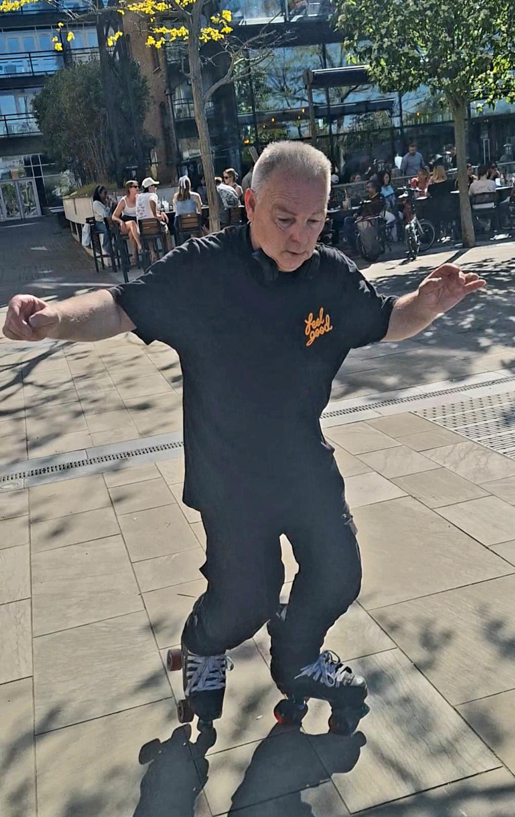 I've been skating probably say about 40 years now, since the 80s. They're coming out with all these funky moves on the floor you know?Yeah, it's all changed, all different moves. I just love it, man. There's loads of moves that you could do. Yeah, like a jazz move, drop-down, come up. I used to do that. (9:33) That was wicked. Everybody knew me from that Hyde Park. But, because I can't do it now, I'm pretty frustrated. But one leg spins, they know me for that as well. I love one leg spins. There's loads of moves.