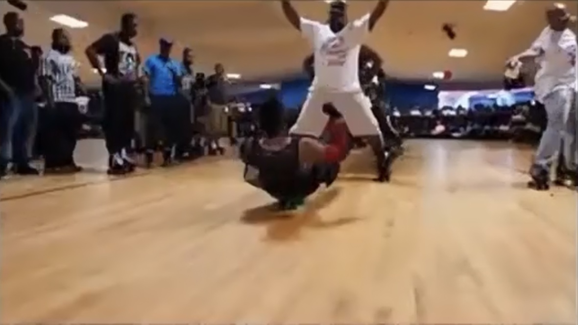 Rhythm or jam skaters dancing and working out moves congegate in the middle